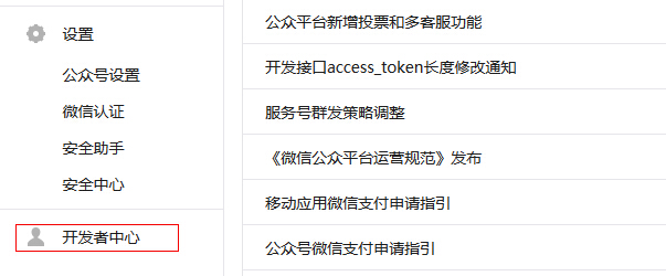 1、登录 微信公众平台(http://mp.weixin.qq.com/),登录之后点击左侧菜单的“开发者中心”,下图红框中所示。
